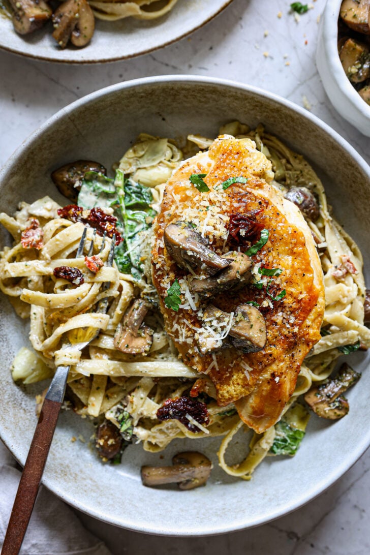 Use the oil from the sun-dried tomatoes: It’s loaded with flavor. A teaspoon or two in the sauce or mushrooms add some excellent umami!